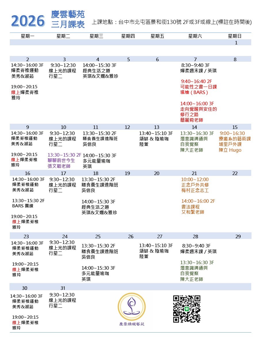 慶雲藝苑3月一覽課表